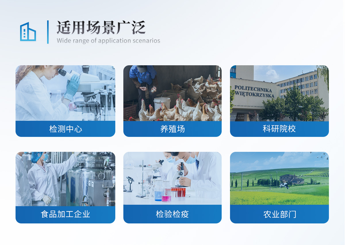 該儀器廣泛應(yīng)用于食藥監(jiān)局、衛(wèi)生監(jiān)督部門、農(nóng)業(yè)部門、商業(yè)系統(tǒng)養(yǎng)殖場、屠宰場、食品肉產(chǎn)品深加工企業(yè)、畜牧獸醫(yī)、檢驗(yàn)檢疫部門、食品生產(chǎn)企業(yè)、農(nóng)副產(chǎn)品批發(fā)市場、農(nóng)業(yè)生產(chǎn)基地、超市、餐廳、高教院校、食堂等單位部門對食品中的不安全指標(biāo)進(jìn)行監(jiān)測使用。